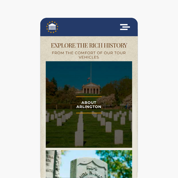 Through the use of vivid images and elegant design, we developed an informative fully responsive and mobile-friendly website that features a great deal of information about Arlington National Cemetery while capturing the majesty of these hallowed grounds. Guests now had the opportunity to learn more about the tour, read about notable graves, and utilize a variety of online resources to plan their visit to Washington, DC.